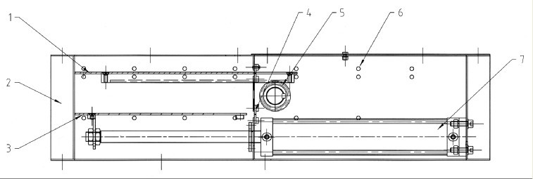 1、上閘門(mén) 2、外殼 3、下閘門(mén) 4、密封條 5、傳動(dòng)機(jī)構(gòu) 6、支撐板 7、氣缸